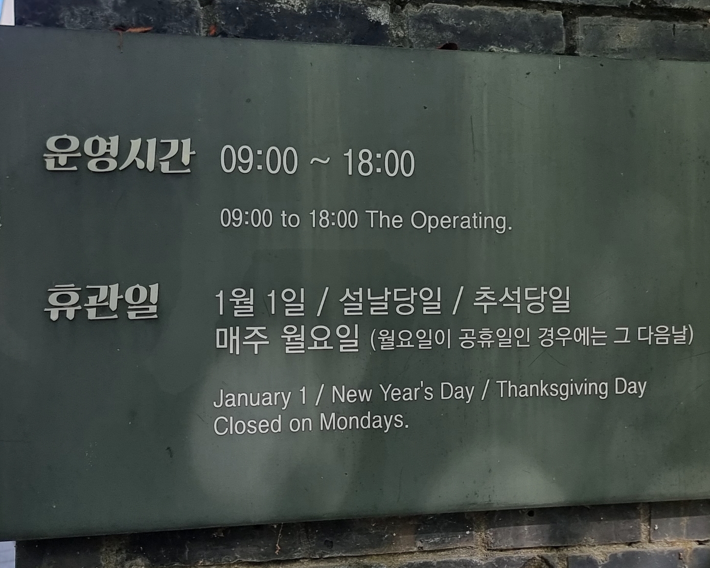 09:00 ~18:00까지이고 휴관일은 1월1일 / 설날당일 / 추석당일 / 매주 월요일입니다.
