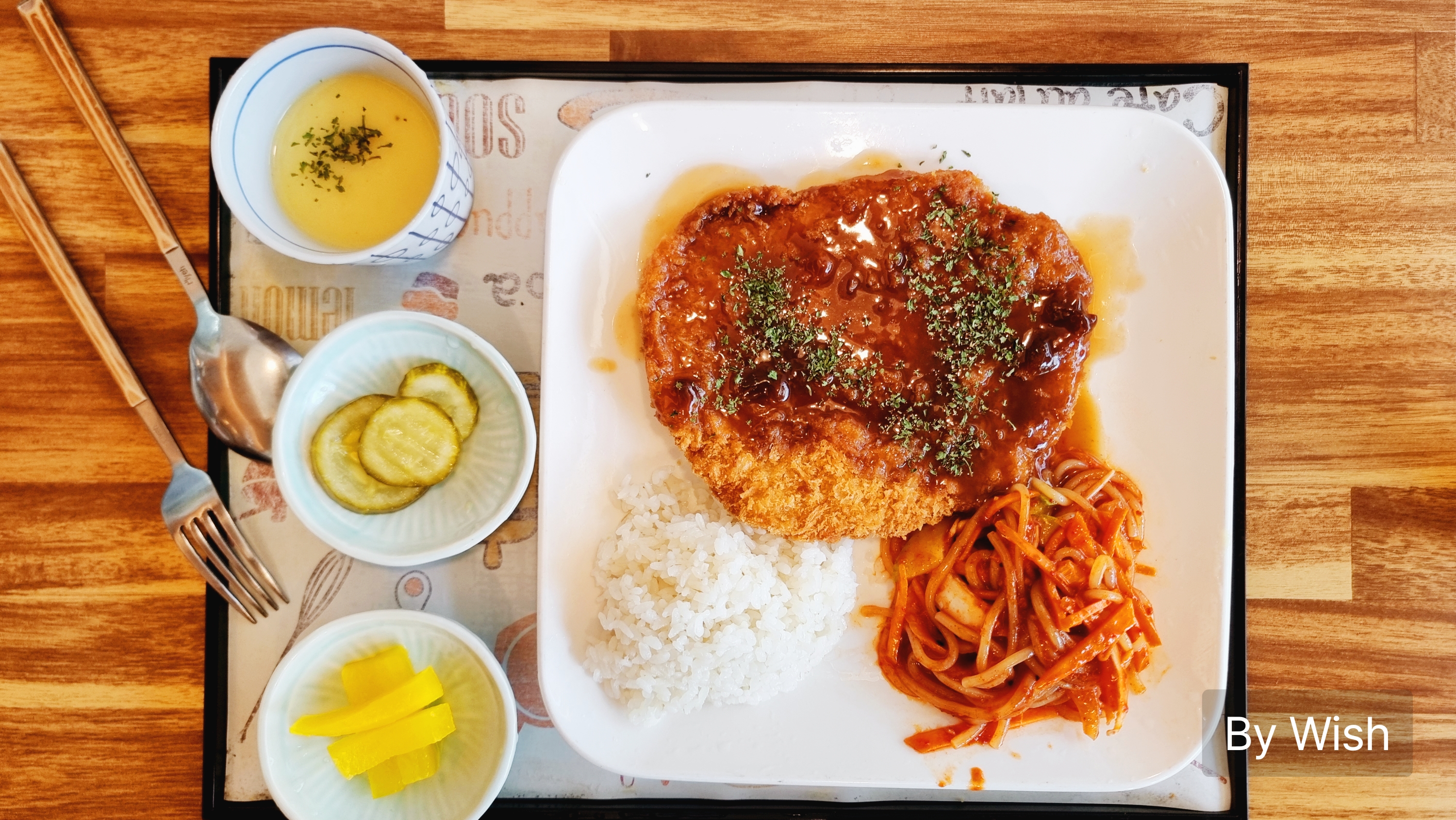 등심돈가스 정식에는 쫄면이 살짝 나옵니다. 수프는 모든 메뉴에 나온 거 같습니다.