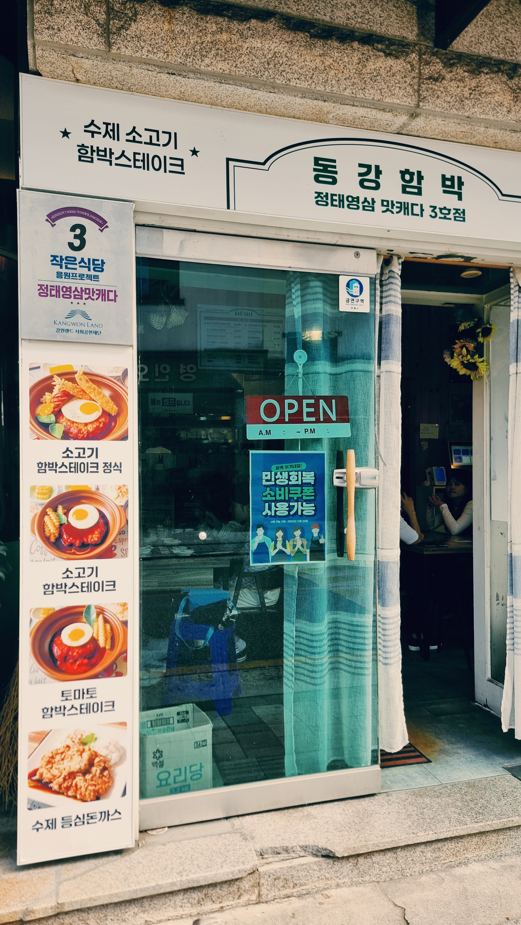 영월 가볼만한 식당_동강함박청록다방 옆 골목으로 들어서면 좌측에 "동강함박" 식당이 있습니다. 겉은 화려하지 않아도 옛날 엄마 손잡고 장날 돈가스 먹던 추억이 떠올라 우연히 들어갔습니다. 그런데 이 집 맛집이었습니다. 함박스테이크와 돈가스가 주메뉴이고 함박스테이크는 뚝배기에 나와 다 먹을 때까지 온기가 그대로입니다.